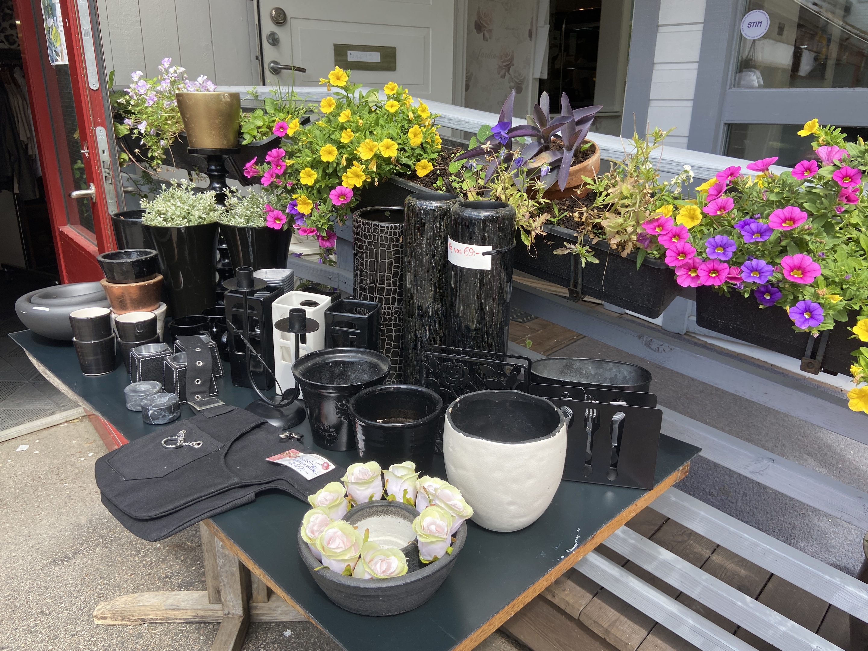 barnkläder, krukor, väskor, smycken och prydnadsföremål.